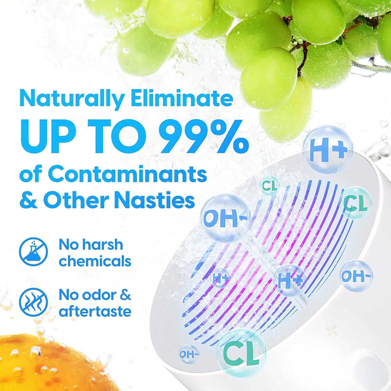 ⚡ Deep-Clean Electrolysis – low-voltage titanium electrodes split water molecules into powerful OH- and H+ micro-bubbles that lift pesticide wax, hormone residues, E. coli and surface dirt 3× more effectively than running tap water alone—no soaps, no ozone smell, no chemical aftertaste.